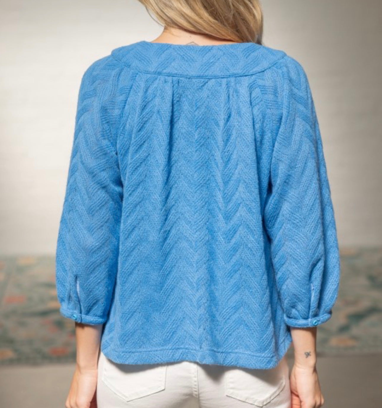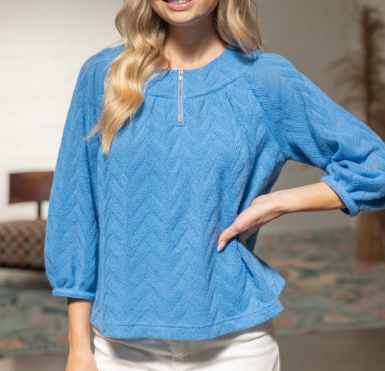 This blue knit top is a refreshing piece for the Fall/Winter season, offering a lightweight yet cozy feel. It features a subtle herringbone texture throughout, with a partial zip at the neckline for a modern touch. The relaxed silhouette and 3/4 sleeves add effortless charm, making it easy to style with denim or tailored bottoms.