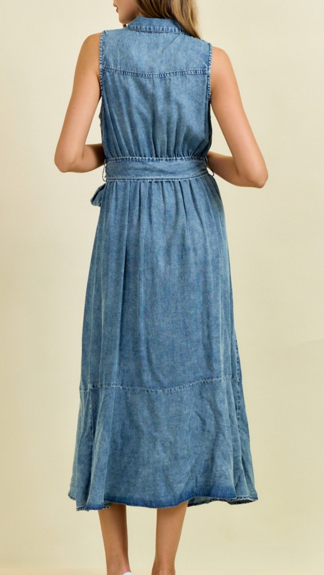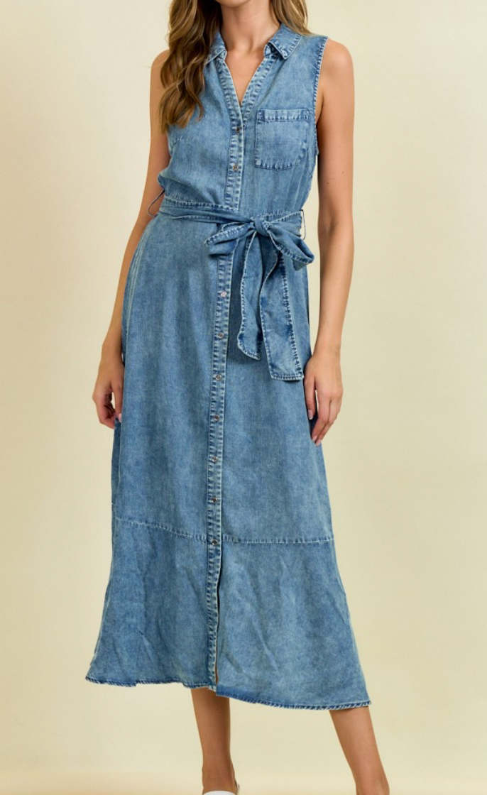 BUTTON FRONT TENCEL MIDI DRESS W/ TIE BELT AND RUFFLE HEM - Crafted from soft TENCEL fabric for a lightweight, breathable feel - Removable tie belt at the waist to accentuate silhouette - Ruffle hem detail adds a touch of femininity - Sleeveless design with collared neckline for a classic look - Button front closure for easy wear and adjustable style 100%TENCEL