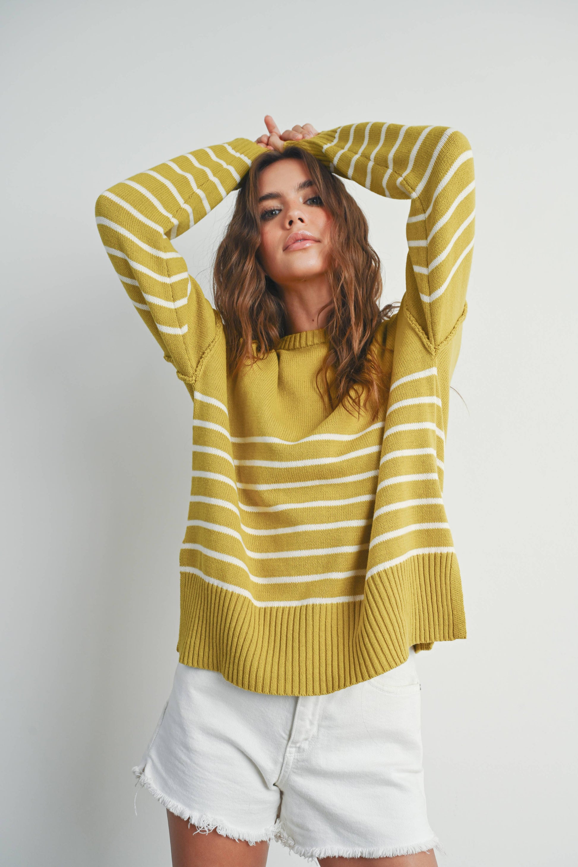 The Drop Shoulder Knit Striped Sweater is a stylish and cozy wardrobe essential. Made from soft, high-quality knit material, this sweater features a relaxed drop-shoulder design for a comfortable fit. The striped pattern adds a trendy and classic touch to the garment, making it versatile for both casual and semi-formal occasions. With its blend of comfort and style, this sweater is perfect for staying fashionable and snug during the cooler seasons.