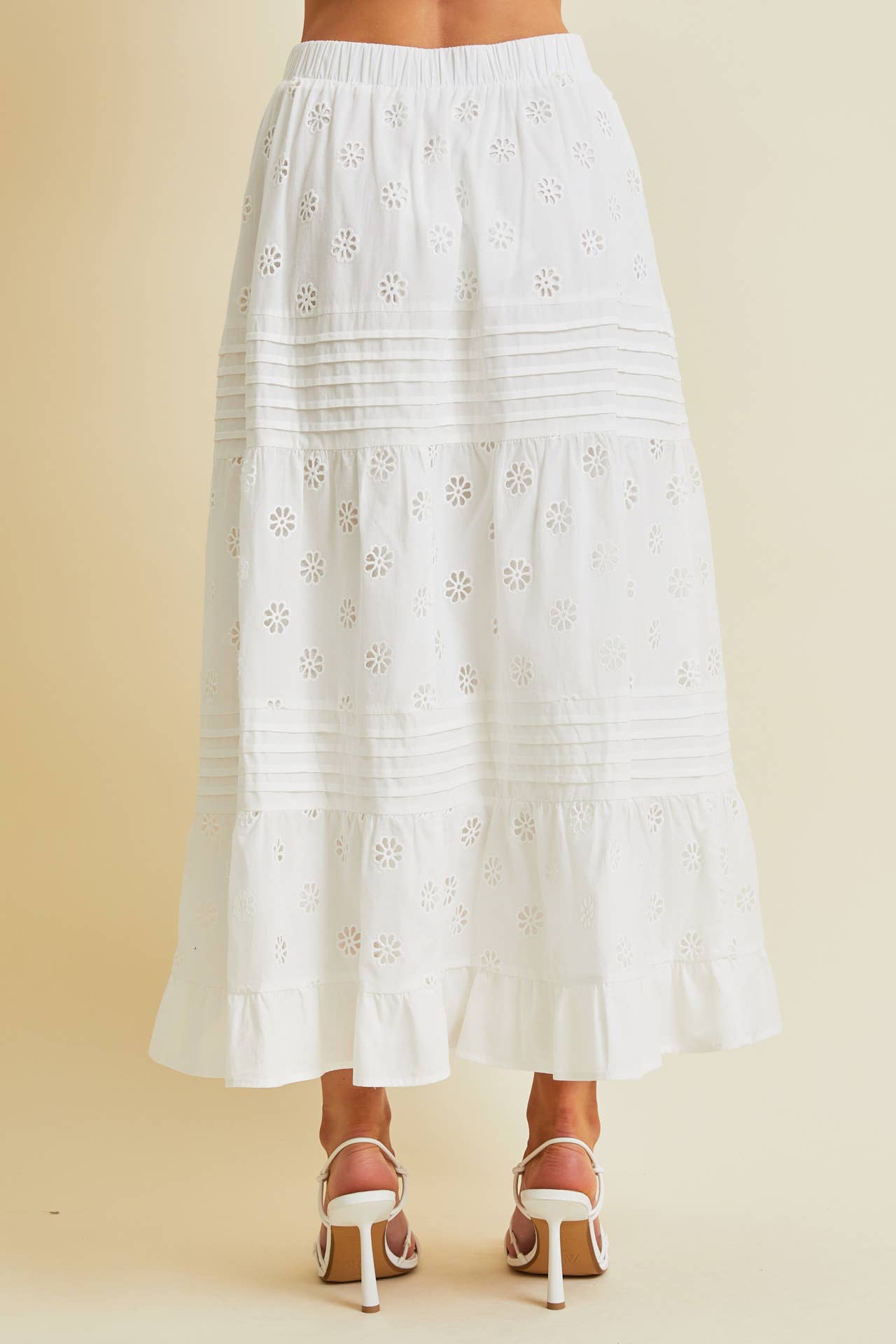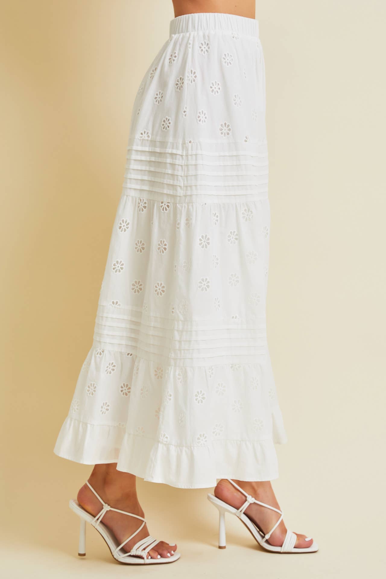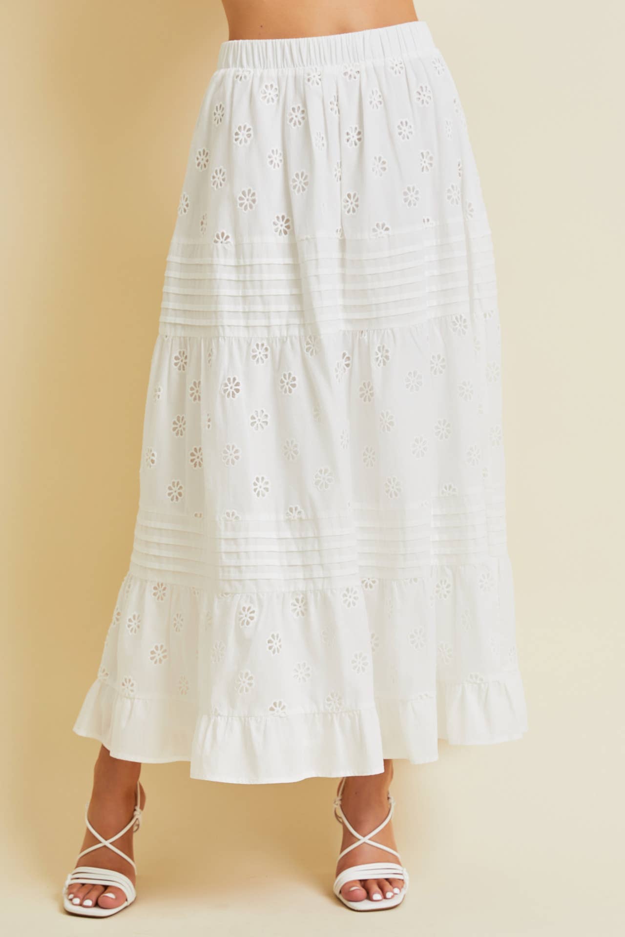 A TRUE CLASSIC IN EVERYONE'S WARDROBE, THIS STUNNING SKIRT IS FEATURED IN ELASTIC WAIST, PIN-TUCKED EYELET DETAIL