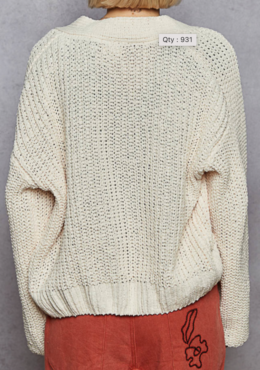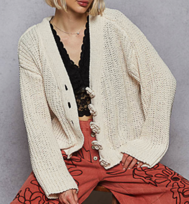 Designed in V-neck long sleeve regular fit cardigan in chenille with exaggerated buttons.