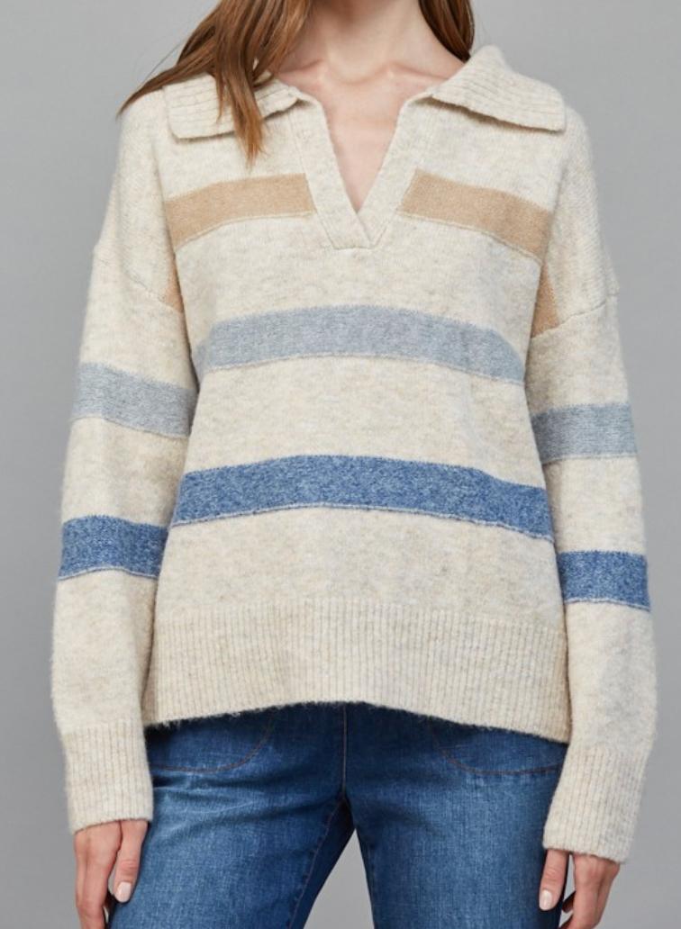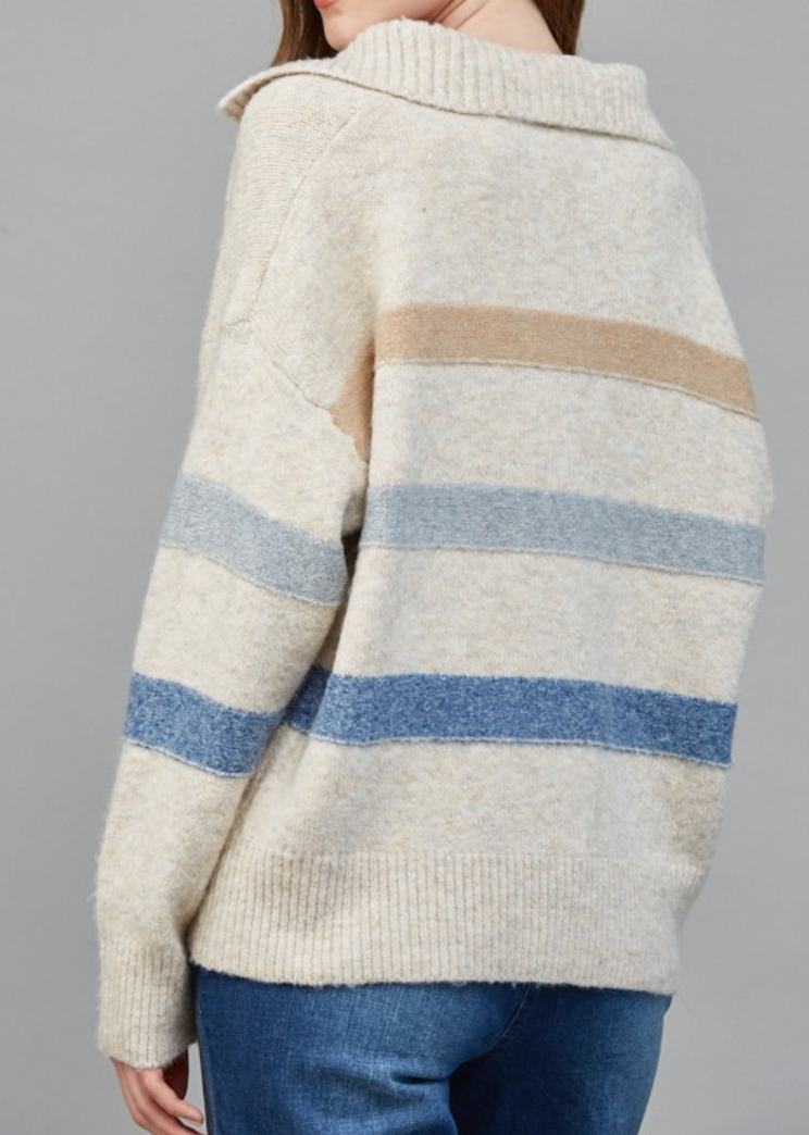 RIBBED WIDE COLLAR WITH V-SLIT STRIPED SWEATER