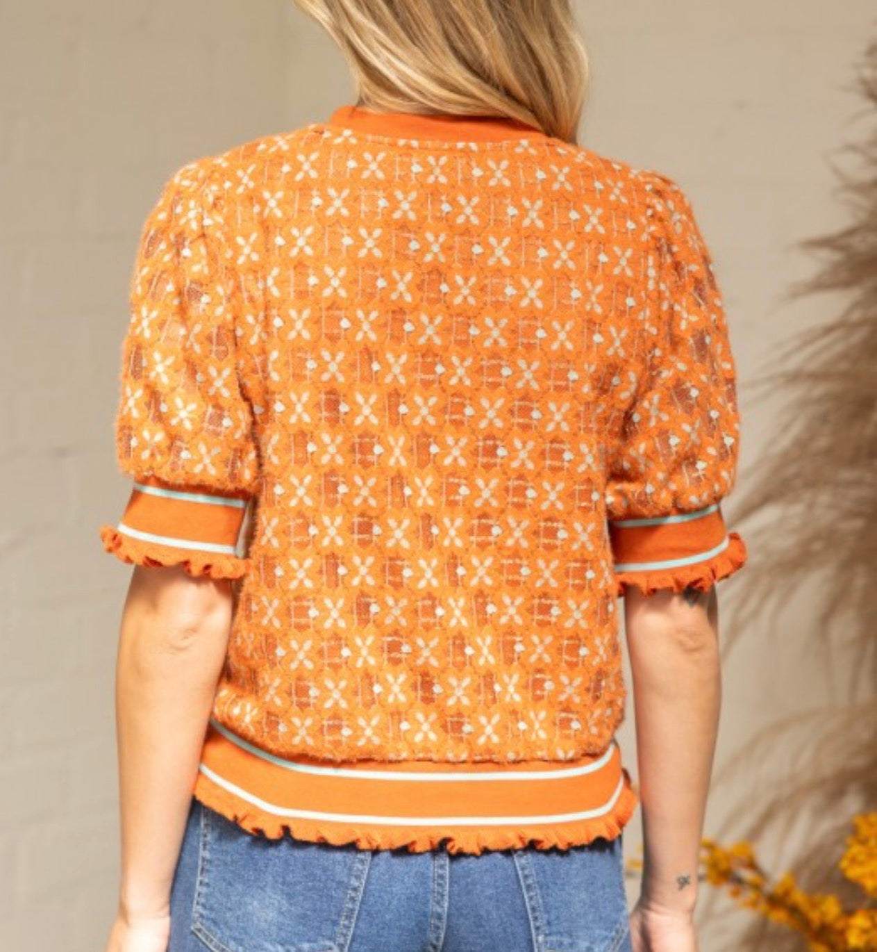 Bright and playful, this orange lace knit blouse features a delicate floral pattern with puff sleeves, ruffle trim, and contrast stripe details. Its lightweight, breathable design makes it perfect for transition wear, while the bold rust-orange tone transitions seamlessly into fall and winter.