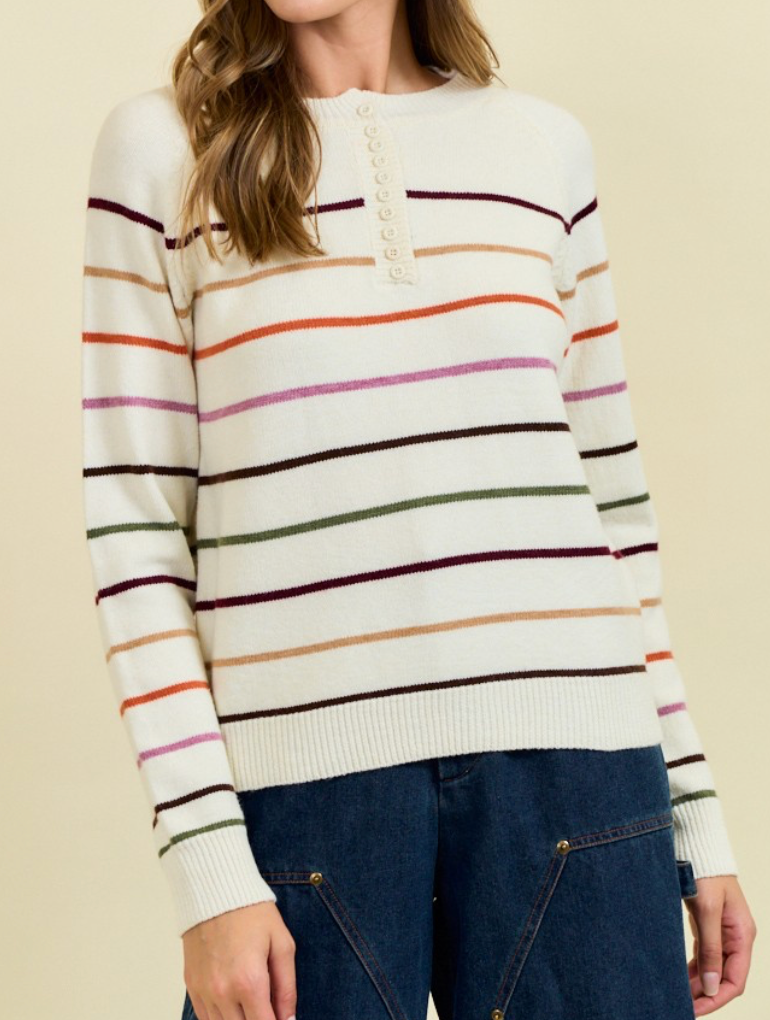 MULTI STRIPES BUTTON DOWN HENRY NECK SWEATER - Classic henley neckline with button-down detailing for a timeless look. - Cozy ivory base highlighted with colorful multi-stripe pattern in shades of orange, pink, green, maroon, and beige for playful versatility. - Soft, medium-weight fabric offers comfortable warmth, ideal for layering in any season. - Long sleeves and ribbed cuffs provide a snug, casual fit. 70%POLYESTER 18%ACRYLIC