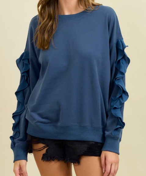 Soft Terry Round Neck Ruffle Trimmed Sleeve Sweatshirt - Soft Terry Fabric: Crafted for comfort and a gentle feel against the skin. - Ruffle Trimmed Sleeves: Unique ruffle detailing along both sleeves adds a trendy, feminine touch. - Ribbed Hems and Cuffs: Enhanced fit and structure with ribbed accents at the cuffs and hem. - Versatile Slate Blue Color: A chic, wearable shade that pairs effortlessly with jeans, shorts, or skirts. 50%COTTON 50%POLYESTER