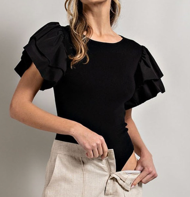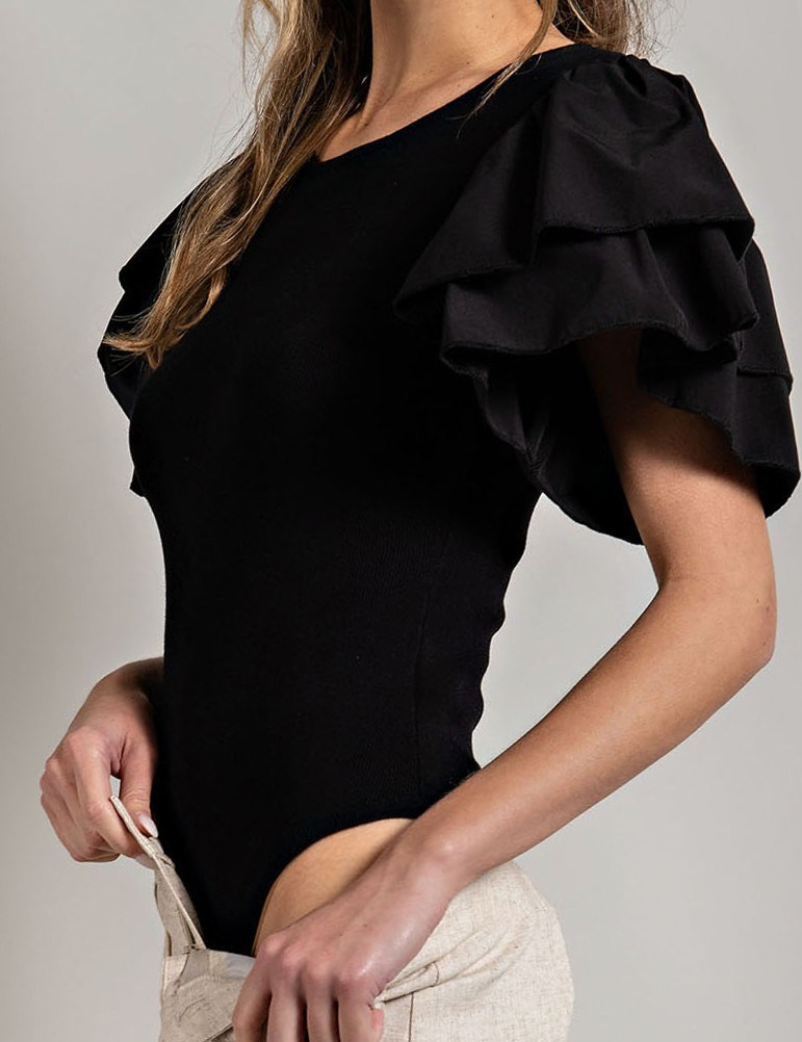 Sweater bodysuit with tiered ruffled sleeves. Perfect for gameday!